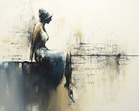 Vrouw Abstract | Serene Script - Dit vrouw schilderij toont een zittende vrouw in reflectieve houding, gevangen in een reeks abstracte, neutrale tinten met gedetailleerde tekstuele elementen op de achtergrond.