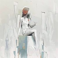 Vrouw Abstract | Vrouw Zittend - In dit abstract schilderij zie je een vrouw in een lichte jurk, rustig zittend op een kubus met een neutrale achtergrond en enkele subtiele kleuraccenten.