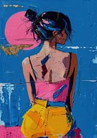 Vrouw Achter - In dit schilderij zie je een vrouw met een roze top en gele broek, zich omkeren naar een grote roze cirkel op een helderblauwe achtergrond, wat een modern en vrolijk gevoel geeft aan de kunst.