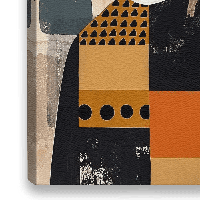Vrouw | Beauty in Abstract Forms - Dit vrouwen schilderij toont een elegante, gestileerde vrouw met een sterk grafisch design, gekenmerkt door grote vlakken in zwart en oranje en geometrische patronen.