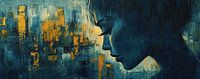 Vrouw Blauw | Echoes of Gold - Dit vrouw schilderij toont een zijprofiel van een vrouw gedomineerd door diepe blauwe en levendige goudtinten, waarbij de abstracte, stedelijke achtergrond haar gedachten lijkt te reflecteren.