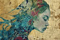 Details: portret, vrouw, blauw, goud, modern, artistiek, elegantie, droombeeld, stedelijk, mozaïek