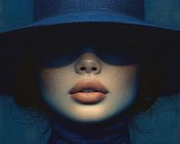 Details: vrouw, portret, blauw, gezicht, schilderij, kunst, mysterieus, modern, minimalistisch, stilte