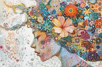 Vrouw Bloemen | Bloem Haar - In dit vrouwen schilderij zie je een vrouw met een kleurrijke bloemenhaard die vol zit met verschillende bloemen en organische vormen, wat een vrolijke en levendige uitstraling geeft.