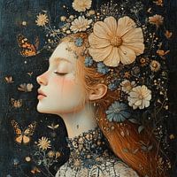 Vrouw Bloemen Slapend - Op dit vrouwen schilderij zie je een jonge vrouw met gesloten ogen, omringd door een overvloed aan bloemen en enkele vlinders, tegen een donkere achtergrond die de details van de bloemen en de pastelkleurige huid van de vrouw benadrukt.