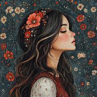 Vrouw Bloemen - Op dit vrouwen schilderij zie je een jonge vrouw met gesloten ogen en lange, donkere haren, haar gezicht omringd door levendige rode bloemen tegen een donkerbloemige achtergrond.