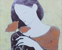 Vrouw Bloemen - Een vrouw en twee bloemen — meer heeft dit schilderij niet nodig om je stil te krijgen. De compositie zet alles op een zachte ademhaling: een langwerpig, bijna witte gelaat dat langzaam naar beneden helt, en twee platte, oranje bloemschijven die dicht tegen haar borst en hand aanleunen. Het is een vrouw schilderij en tegelijk een bloemen schilderij, maar belangrijker: het is een schilderij over aanraking en teruggetrokkenheid. De gesloten ogen en het licht gebogen hoofd vertellen van inwardness; de bloemen zijn niet trots, ze zijn fluisterend, ze worden vastgehouden alsof ze zelf te kwetsbaar zijn om losgelaten te worden.