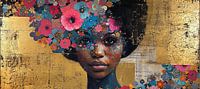 Details: portret, vrouw, bloemen, modern, kunst, gezicht, goud, zwart, abstract, canvas