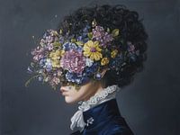 Vrouw Bloom - Dit schilderij opent met een onverwachte grap: een explosie van bloemen versluiert het gezicht alsof iemand de lente een permanent abonnement heeft gegeven op iemands blik. In het midden zie je geen ogen, alleen een weelderige massa van rozen, viooltjes, madeliefjes en kleine blaadjes die zich als een sluier over het…