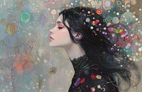 Vrouw | Dreamy Escape - Dit vrouwen schilderij toont een jonge vrouw met gesloten ogen, omgeven door een gedetailleerde kosmische achtergrond vol kleurrijke, abstracte patronen en vormen die op een dromerige lucht lijken.