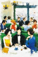 Vrouw Geel | Yellow Charm - Dit restaurant schilderij toont een vrouw in een gele jurk en een man in een zwart pak, zittend aan een tafeltje met een kopje koffie, omringd door kleurrijke gasten in een gezellige horeca-setting.