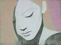 Vrouw Gezicht | Adem - Dit is een ingetogen, bijna fluisterend vrouwelijk portret dat meteen één ding duidelijk maakt: stilte als onderwerp. Het gezicht neemt bijna het hele vlak in, strak gecentreerd en sterk ingezoomd. De ogen zijn gesloten; één lange, donkere wimperlijn valt als een grafietstreek over het bleke gelaat. Door de keuze…
