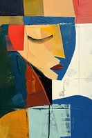 Details: abstract schilderij, vrouw, portret, modern, blauw, oranje, rood, minimalistisch, kunst, moderne kunst