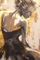 Vrouw Goud | Elegance Unveiled - Dit vrouwen schilderij toont een elegante dame vanaf de rug gezien, in een zwart jurkje tegen een gouden achtergrond, uitgevoerd in een stijl die dynamiek en mysterie uitstraalt door het gebruik van brede, expressieve penseelstreken.