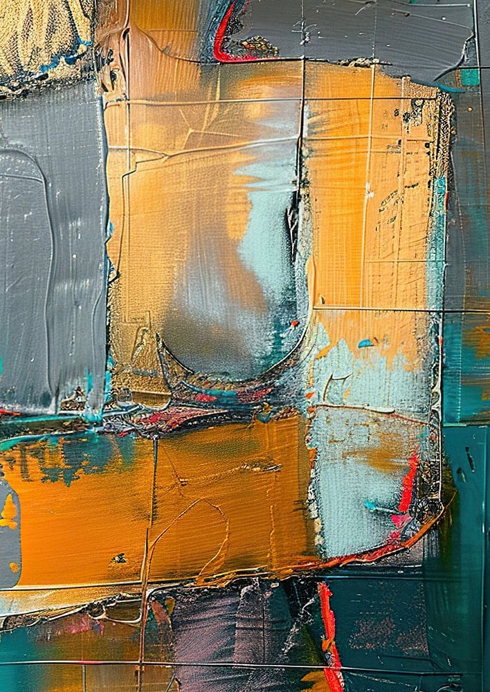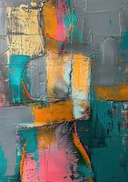 Vrouw Goud Oranje | Elegante Vrouw in Kleur - In dit abstract schilderij zie je een elegante vrouw in warme kleuren zoals goud, oranje en roze, met een dynamische achtergrond van turquoise en grijs, waardoor het geheel een moderne uitstraling krijgt.