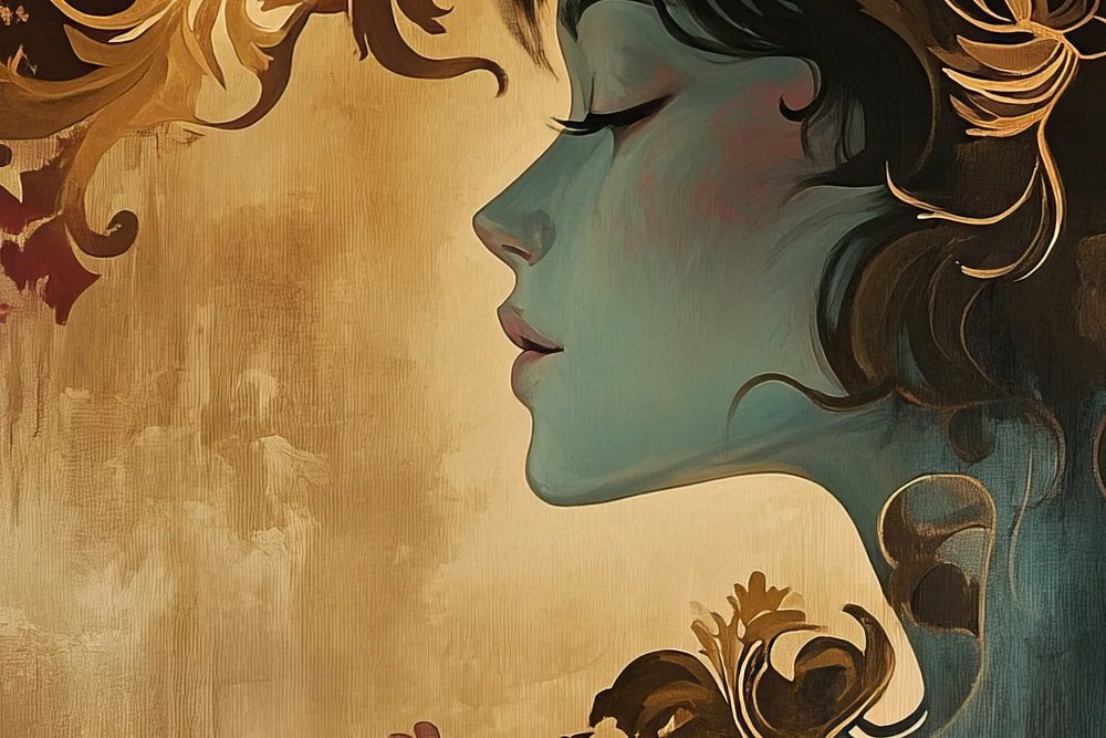 Details: vrouwen schilderij, profielschilderij, abstracte kunst, dromerige kunst, moderne rococo, gouden ornamenten, serene vrouw, artistiek portret, fantasie kunst