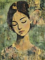 Vrouw Goud - Dit is een vrouwen schilderij, een schilderij vrouw met een serene uitdrukking en gesloten ogen, modern figuratief geschilderd in ingetogen aardetinten en goudaccenten met bloemen in haar haar en een verweerde textuur van groen en beige.