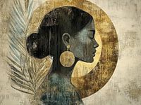 Vrouw Goud - In dit vrouwen schilderij zie je een vrouw in profiel met gesloten ogen, een grote ronde gouden oorbel en een cirkelvormige gouden halo achter haar hoofd, geschilderd als modern portret in ingetogen aardetinten en gestructureerde textuur; dit vrouwen schilderij, schilderij vrouw legt de nadruk op goud en…