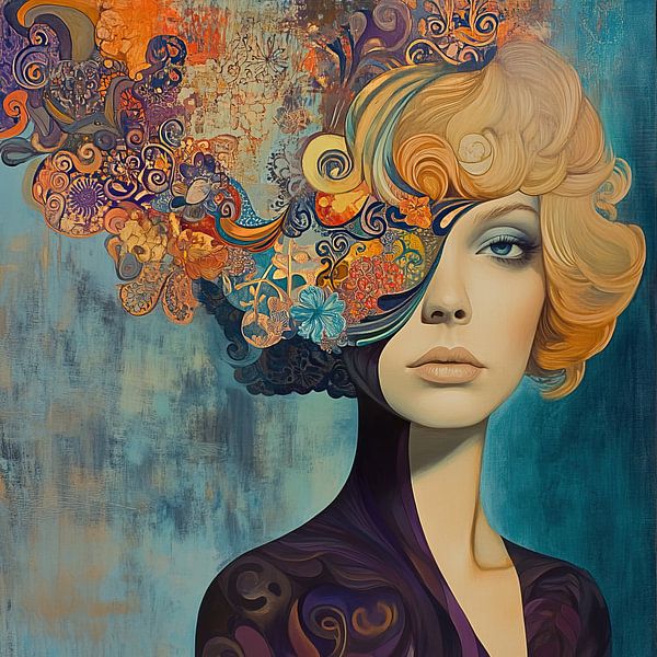 Vrouw Haar - Op dit abstract portret schilderij zie je een vrouw met een opvallende, creatieve haardos vol kleuren en vormen, die samen een levendig patroon vormen tegen een rustige achtergrond.
