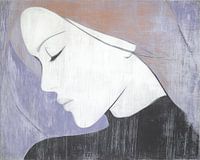 Het tweede dominante element is het veld van kleur dat haar omringt: een zachte lavendelachtige achtergrond en een warme perzik/terracotta in het haar of de sluier die over haar hoofd valt. Die vlakken zijn niet glad, maar licht gerookt en gekrast – je ziet de lagen die elkaar doorsnijden. De paarse ruimte rondom de hals en het hoofd contrasteert subtiel met het bijna witte gezicht en de donkere kleding. Die combinatie van paars en perzik maakt van dit minimalistisch schilderij een oefening in sfeer: koel en warm tegelijk, nostalgisch en modern. De kleurvelden lezen als ademruimtes rond de figuur, ze ondersteunen het portret zonder te domineren.