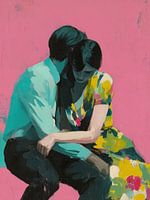 Vrouw Jurk | Colorful Embrace - Dit schilderij toont een vrouw met een kleurrijke jurk en een man die intiem samen zitten, met een opvallende roze achtergrond die de energieke sfeer versterkt, waardoor dit een prachtig modern kunstwerk is.