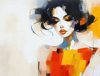 Vrouw Kleur - Dit moderne vrouwenportret schilderij toont een stijlvolle vrouw met geaccentueerde, scherpe gelaatstrekken en abstract gebruik van felle kleuren zoals oranje en geel, wat een dynamisch en visueel aantrekkelijk beeld oplevert.