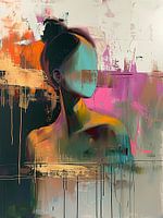 Vrouw Kleuren | Vrouw met Kleur en Beweging - Dit is een abstract schilderij van een vrouw met een gepersonaliseerde, vlakke uitstraling en felle kleuren zoals groen, oranje en roze, die samen zorgen voor een dynamisch effect.