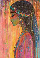 Vrouw Kleurrijk Detail - Dit kleurrijke vrouwenportret schilderij toont een zijprofiel van een vrouw met lang, donker haar versierd met levendige, veelkleurige stippen tegen een achtergrond met levendige, verticale strepen in een rijk scala aan kleuren.