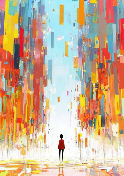 Vrouw Kleurrijk | Vrouw Kijkt naar Kleurrijke Hoogtes - In dit abstract schilderij zie je een klein vrouwtje in een rode jas dat staat te kijken naar kleurrijke, verticale vlakken van verschillende tinten, die een gevoel van ruimte en diepte creëren.