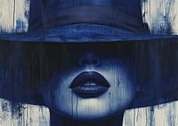 Details: vrouw, portret, modern, mysterieus, canvas, kunst, blauw, zwart, lippen, hoed