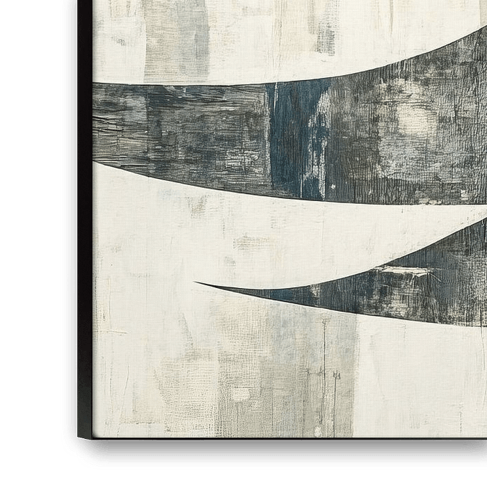 Vrouw Kunst | Vrouw Rust - Op dit moderne vrouwenportret schilderij zie je een serene vrouw met lang, zwart haar en gesloten ogen tegen een achtergrond van abstracte, geometrische vormen in zachte blauwe, witte en grijze tinten.