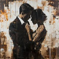 Vrouw Man Goud - Op dit vrouwen schilderij zie je een man en een vrouw dicht tegen elkaar aan in een intieme omhelzing, een modern figuratief koppel schilderij met ruwe penseelstreken, druipende verf en ingetogen aardetinten met goudaccenten die het schilderij vrouw en het koppel schilderij een warme, stille romantiek…