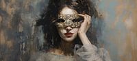 Vrouw & Masker - Op dit intrigerende doek zie je een jonge vrouw met een mysterieuze uitdrukking, haar blik schuilgaand achter een rijk versierd masker. Het spel van licht en donker, de textuurrijke toetsen en de harmonieuze balans van blauwe en aardse tinten benadrukken het gevoel van verborgenheid dat maskers met zich meebrengen. De visuele diepte en uitgesproken penseelstreken geven het portret een moderne twist en weerspiegelen stilistisch de complexiteit van het onderwerp.