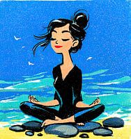Vrouw Meditatie - Dit is een vrouw schilderij van een ontspannen vrouw in een meditatieve houding, zittend op stenen aan de zee, omgeven door een stralende blauwe lucht en een vrolijke zee, waarmee het een positieve yoga vibe oproept.