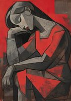 Details: vrouwen schilderij, vrouw rood, modern kunst, somber, aardetinten, geometrisch, abstract, kunst, figuratief, expressief