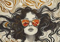 Vrouw Met Vuur - Dit werk is een confrontatie tussen twee grote elementen: het volstromende zwarte haar en de brandschone, psychedelische glazen van een zonnebril. Als je er naar luistert in je hoofd, voel je eerst de stroom van het haar — het heeft gewicht, het beweegt als golven en laat overal fijne gouden aderlijnen achter. Het gezicht zelf is rustig, bijna ingetogen, bijna als een blad papier waarop die twee krachtlijnen botsen: de donkere krullen en het vuur in de glazen. Het is een vrouw schilderij waarin het portret rustig blijft maar tegelijk wordt overgenomen door beweging en kleur; een portret schilderij dat op twee manieren tegelijk spreekt.