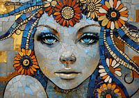 Details: vrouw, mozaïek, goud, blauw, bloem, portret, kunst, modern, ogen, schoonheid