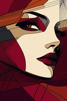 Deze intrigerende digitale illustratie toont een vrouwelijk gezicht opgebouwd uit strakke geometrische vormen en krachtige contrasten. Diepe rode en warme aardetinten wisselen af met scherpe zwarte accenten, wat een gedurfde en expressieve compositie creëert. Haar intense blik en perfect gevormde lippen stralen mysterie en zelfvertrouwen uit, terwijl de strakke lijnen en dynamische structuren een moderne, bijna futuristische uitstraling geven. Een stijlvol en krachtig kunstwerk dat elegantie en mysterie combineert.