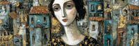 Vrouw Oorbel - Op dit schilderij van de Mediterrane regio zie je een vrouw met een opvallende gouden oorbel, terwijl ze voor kleurrijke gebouwen staat, wat een gevoel van warmte en cultuur oproept.