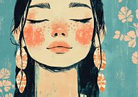 Vrouw Oorbellen - Op dit vrouwen schilderij zie je een serene vrouw met gesloten ogen, opvallende oranje oorbellen en een lichte huid, tegen een zachtblauwe achtergrond met bloemenpatronen die een gevoel van rust en meditatie uitstralen.