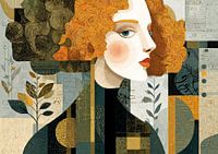 Vrouw Portret | Abstracte Vrouw met Krullen - In dit abstract portret schilderij zie je een vrouw met een opvallende krullende oranje haar, die een expressieve blik heeft en omringd is door geometrische vormen en subtiele plantmotieven.