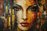 Vrouw Portret | Inner City Eyes - Dit vrouw schilderij toont een expressief, bijna levensecht portret van een vrouw met opvallende scherpe blik en volle, zacht glanzende lippen, omgeven door abstracte, stedelijke structuren in zware, goudgele en roestbruine verftonen.