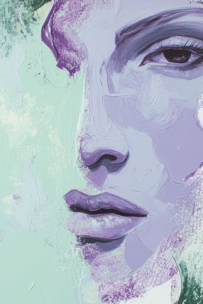 Dit expressieve portret toont het gezicht van een vrouw in lavendel- en mintgroene tinten, uitgevoerd in een krachtige verfstructuur. De intens donkere ogen en subtiele schaduwwerking contrasteren met de zachte, vloeiende penseelstreken die zich oplossen in een etherische waas. De combinatie van pastel en diepte geeft het werk een gevoel van mysterie en introspectie, perfect voor een eigentijds interieur dat zachtheid en karakter wil combineren.