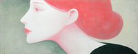 Wat dit schilderij doet, is een soort stilte zichtbaar maken. De keuze voor weinig details in combinatie met sterke kleuraccenten — het bijna witte gezicht tegenover het levendige haar — zorgt voor een contemplatieve sfeer. De kijker wordt uitgenodigd mee te gaan in die bedachtzame ruimte: het is een portret dat niet vraagt om herkenning van een persoon, maar om herkenning van een stemming. De eenvoud van het beeld en de spaarzame, precieze kleurkeuzes maken dit een sterk voorbeeld van een hedendaags portret schilderij waarin minimalisme en emotie samensmelten.