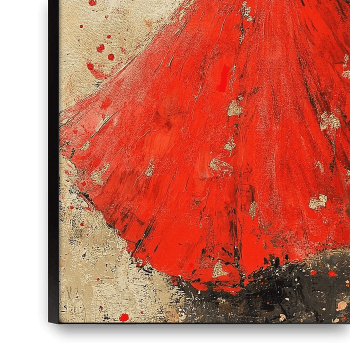 Vrouw Rode Jurk - Dit kunst schilderij van een vrouw in een rode jurk straalt een gevoel van rust en verfijning uit, waarbij de rode kleur en gouden accenten een serene atmosfeer creëren tegen een neutraal achtergrond.