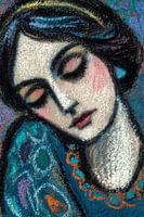 Details: vrouwen schilderij, vrouw, kleurrijk, sieraden, abstract, kledingstuk, pastel, blauw, groen,…