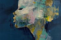 Details: abstract schilderij, vrouw schilderij, profiel, moderne kunst, blauw, groen, goud, vrouw stijfsel, kleurrijk, kunst