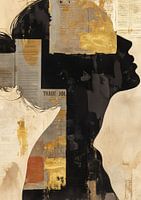 Vrouw Silhouet - Dit moderne vrouwen schilderij combineert een silhouet in zwart met goudkleurige accenten en overlappende krantenfragmenten, waarbij texturen en schakeringen een gevoel van diepte creëren.
