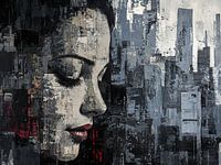 Vrouw Stad | Concrete Slumber - Dit stedelijke vrouw schilderij combineert een close-up portret van een vrouw met gesloten ogen tegen een achtergrond van abstracte industriële wolkenkrabbers, geschilderd in overheersende grijstinten met accenten van rood en wit.
