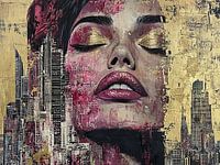 Vrouw Stad | Urban Dreams - Dit vrouw schilderij vermengt het portret van een gesloten-ogen vrouw met een gouden tint in haar oogschaduw en een stedelijke achtergrond waarin wolkenkrabbers versmelten met de roze en gouden textuur van haar huiddetails.